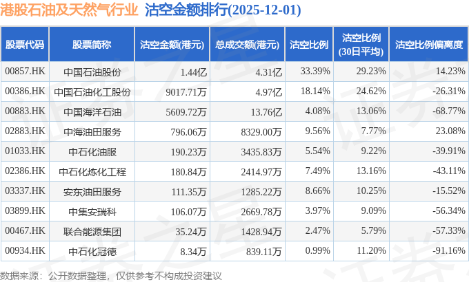 从沽空金额来看,中国石油股份、中国石油化工股份、中国海洋石油沽空金额位居行业前三,分别为1.44亿港元、9017.71万港元、5609.72万港元。