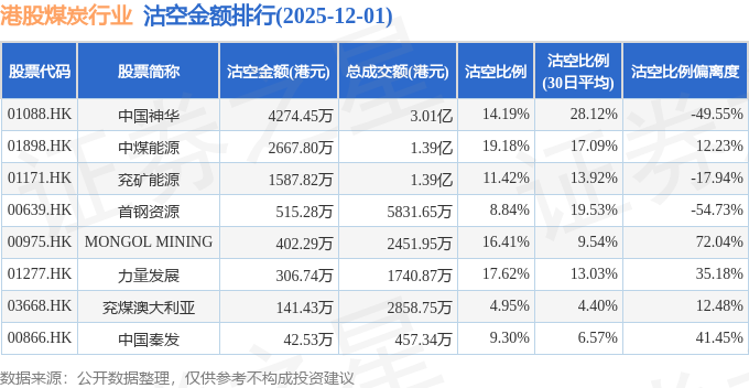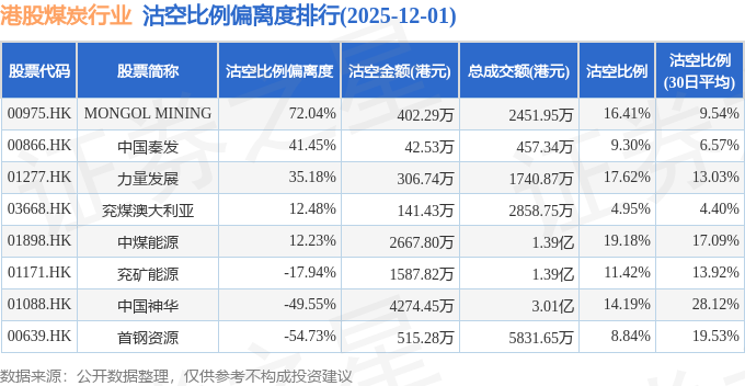 从沽空比例偏离度来看,MONGOL MINING、中国秦发、力量发展沽空比例偏离度位居行业前三,分别为72.04%、41.45%、35.18%。
