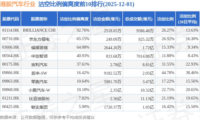 从沽空比例偏离度来看,BRILLIANCE CHI、京东方精电、福耀玻璃沽空比例偏离度位居行业前三,分别为92.76%、65.15%、64.08%。
