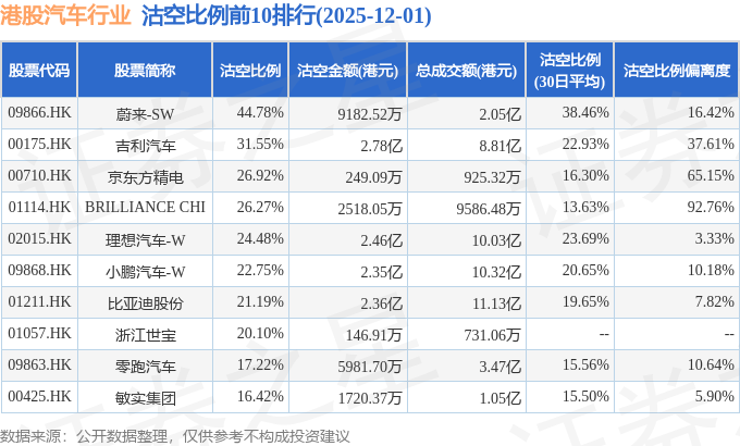 从沽空比例来看,蔚来-SW、吉利汽车、京东方精电沽空比例位居行业前三,分别为44.78%、31.55%、26.92%。