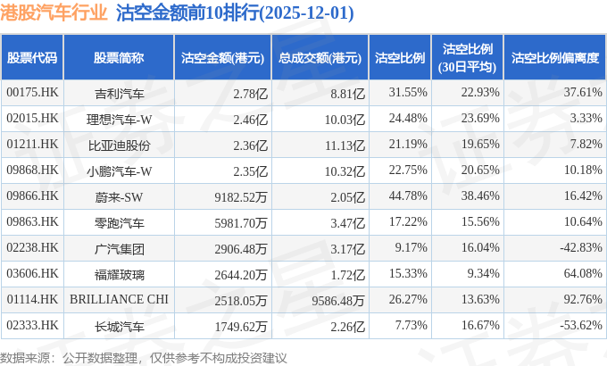 从沽空金额来看,吉利汽车、理想汽车-W、比亚迪股份沽空金额位居行业前三,分别为2.78亿港元、2.46亿港元、2.36亿港元。