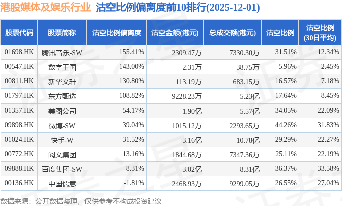 从沽空比例偏离度来看,腾讯音乐-SW、数字王国、新华文轩沽空比例偏离度位居行业前三,分别为155.41%、143%、130.8%。