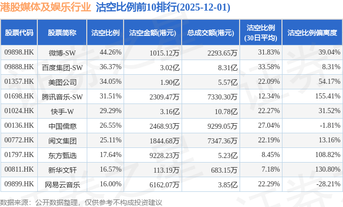 证券之星消息,12月1日港交所披露数据显示,当日港股媒体及娱乐行业的120只个股中有22只被沽空,总沽空股数为6531.23万股,总沽空金额为11.4亿元(港元),而当日媒体及娱乐行业的总成交金额为48.95亿元(港元),沽空比例为23.29%。当日媒体及娱乐行业总体涨0.89%。