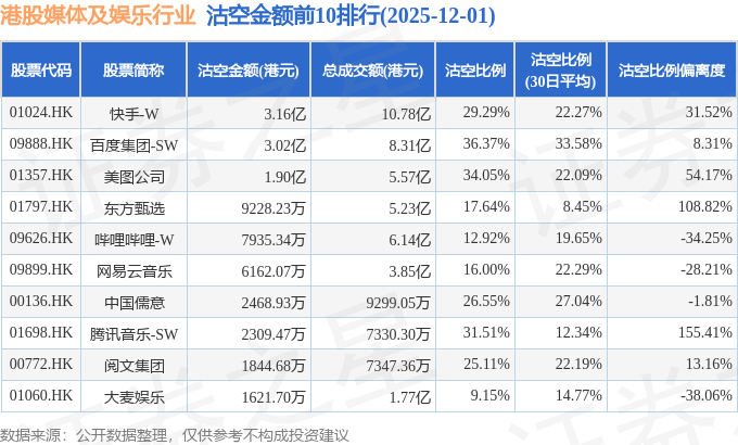 从沽空金额来看,快手-W、百度集团-SW、美图公司沽空金额位居行业前三,分别为3.16亿港元、3.02亿港元、1.9亿港元。
