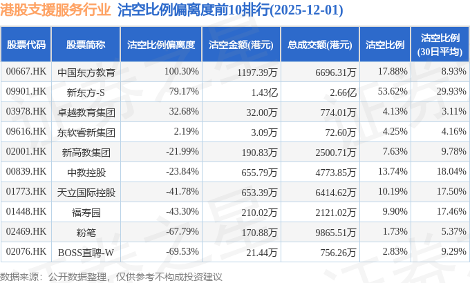 从沽空金额来看,新东方-S、中国东方教育、中教控股沽空金额位居行业前三,分别为1.43亿港元、1197.39万港元、655.79万港元。