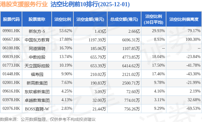 从沽空比例来看,新东方-S、中国东方教育、同道猎聘沽空比例位居行业前三,分别为53.62%、17.88%、16.7%。