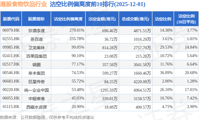 证券之星消息,12月1日港交所披露数据显示,当日港股食物饮品行业的94只个股中有36只被沽空,总沽空股数为2571.88万股,总沽空金额为2.76亿元(港元),而当日食物饮品行业的总成交金额为22.68亿元(港元),沽空比例为12.18%。当日食物饮品行业总体涨0.7%。