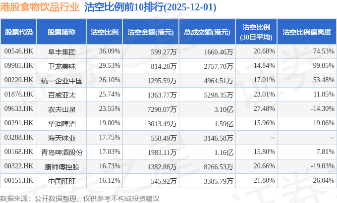 从沽空比例来看,阜丰集团、卫龙美味、统一企业中国沽空比例位居行业前三,分别为36.09%、29.53%、26.1%。