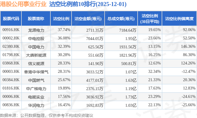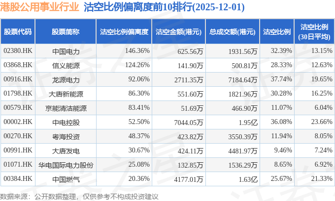 从沽空比例偏离度来看,中国电力、信义能源、龙源电力沽空比例偏离度位居行业前三,分别为146.36%、124.26%、92.06%。