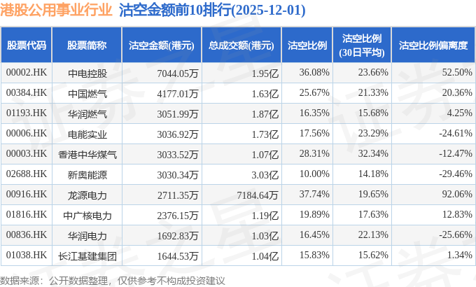 从沽空金额来看,中电控股、中国燃气、华润燃气沽空金额位居行业前三,分别为7044.05万港元、4177.01万港元、3051.99万港元。