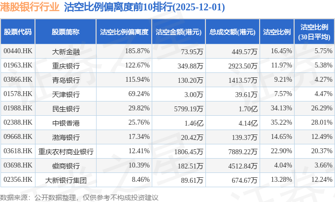 从沽空比例偏离度来看,大新金融、重庆银行、青岛银行沽空比例偏离度位居行业前三,分别为185.87%、122.67%、115.94%。