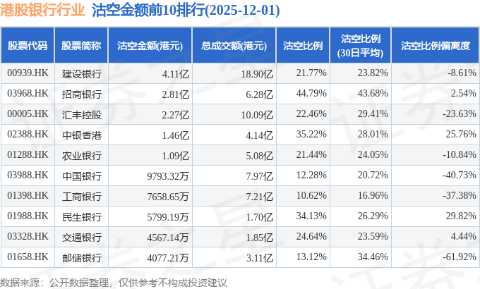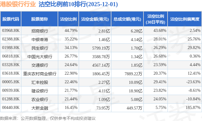 从沽空比例来看,招商银行、中银香港、民生银行沽空比例位居行业前三,分别为44.79%、35.22%、34.13%。