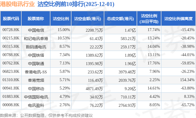 从沽空比例来看,中国电信、和记电讯香港、数码通电讯沽空比例位居行业前三,分别为15%、10.53%、8.57%。