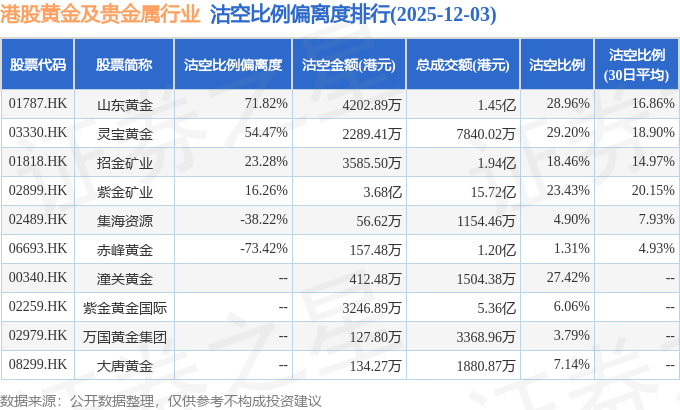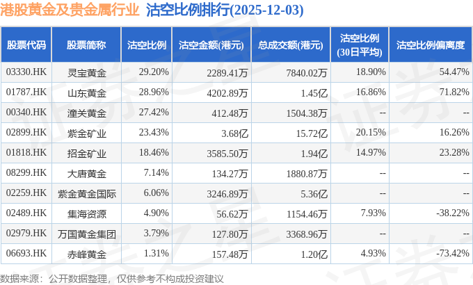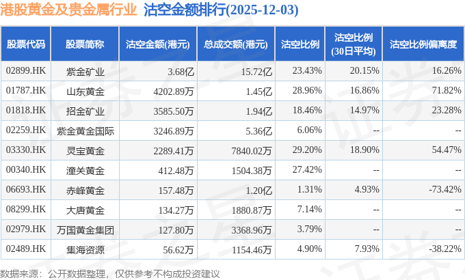 从沽空金额来看,紫金矿业、山东黄金、招金矿业沽空金额位居行业前三,分别为3.68亿港元、4202.89万港元、3585.5万港元。