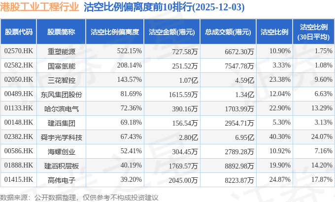 从沽空比例偏离度来看,重塑能源、国富氢能、三花智控沽空比例偏离度位居行业前三,分别为522.15%、208.14%、143.57%。