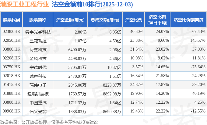 从沽空金额来看,舜宇光学科技、三花智控、协鑫科技沽空金额位居行业前三,分别为2.8亿港元、1.07亿港元、6490.07万港元。