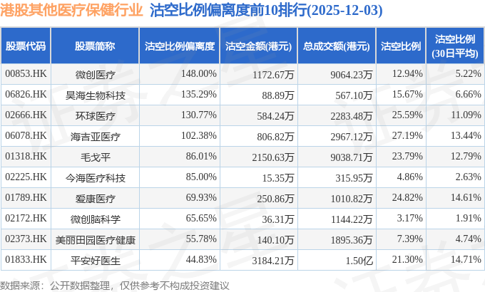 从沽空比例偏离度来看,微创医疗、昊海生物科技、环球医疗沽空比例偏离度位居行业前三,分别为148%、135.29%、130.77%。