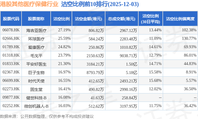 从沽空比例来看,海吉亚医疗、环球医疗、爱康医疗沽空比例位居行业前三,分别为27.19%、25.59%、24.82%。
