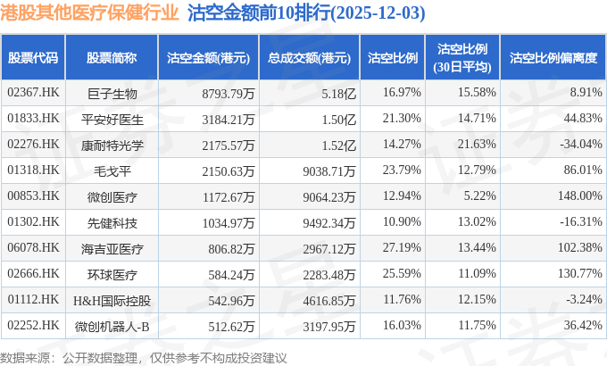 从沽空金额来看,巨子生物、平安好医生、康耐特光学沽空金额位居行业前三,分别为8793.79万港元、3184.21万港元、2175.57万港元。