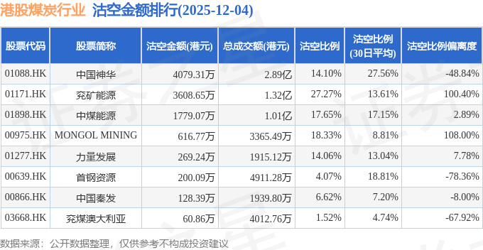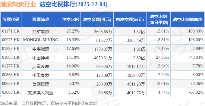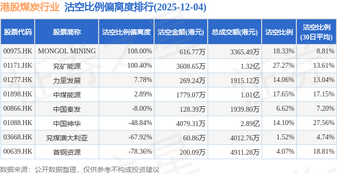 从沽空比例偏离度来看,MONGOL MINING、兖矿能源、力量发展沽空比例偏离度位居行业前三,分别为108%、100.4%、7.78%。