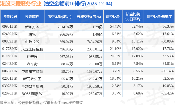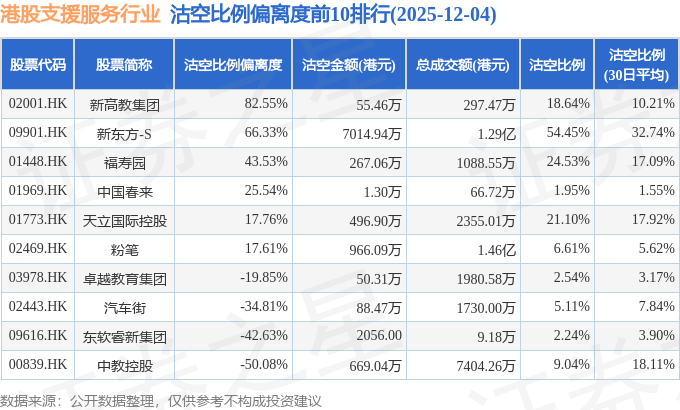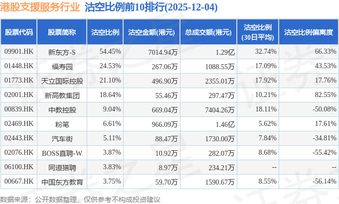 从沽空比例偏离度来看,新高教集团、新东方-S、福寿园沽空比例偏离度位居行业前三,分别为82.55%、66.33%、43.53%。