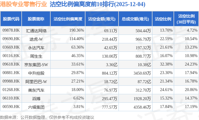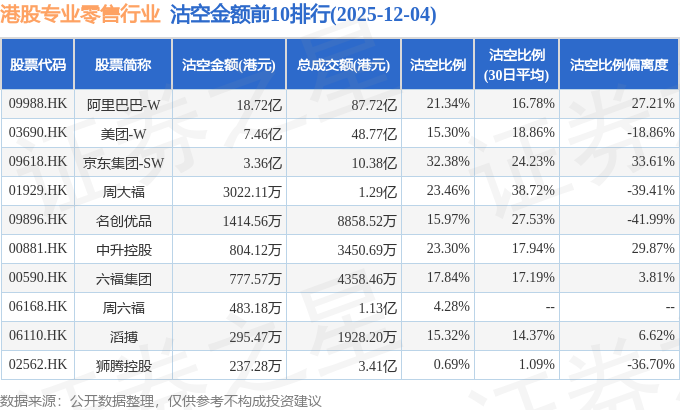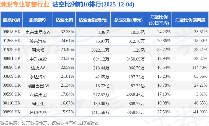 从沽空比例来看,京东集团-SW、美东汽车、周大福沽空比例位居行业前三,分别为32.38%、24.61%、23.46%。