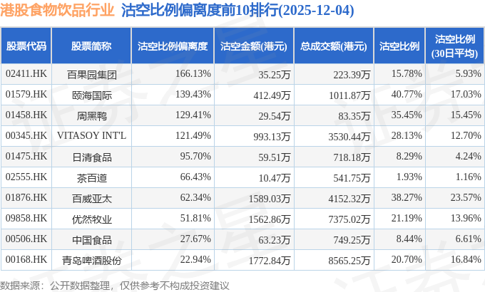 从沽空比例偏离度来看,百果园集团、颐海国际、周黑鸭沽空比例偏离度位居行业前三,分别为166.13%、139.43%、129.41%。