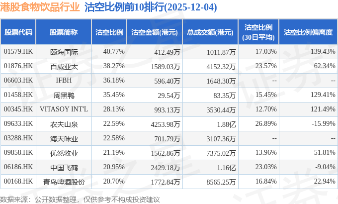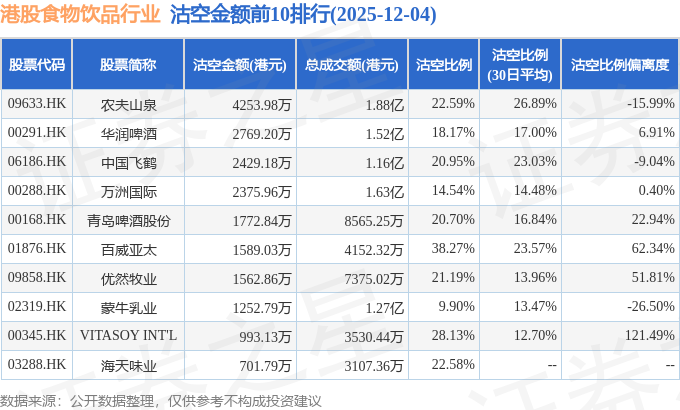 从沽空金额来看,农夫山泉、华润啤酒、中国飞鹤沽空金额位居行业前三,分别为4253.98万港元、2769.2万港元、2429.18万港元。