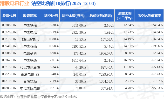从沽空比例来看,中国铁塔、中国电信、数码通电讯沽空比例位居行业前三,分别为15.3%、15.19%、11.8%。