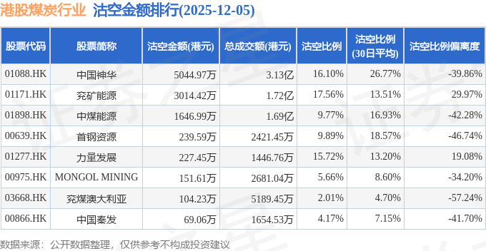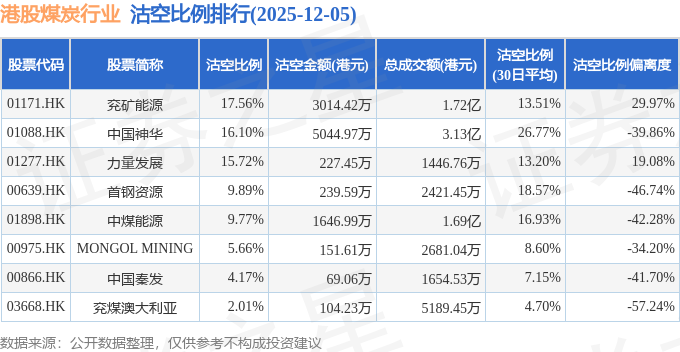 从沽空比例偏离度来看,兖矿能源、力量发展、MONGOL MINING沽空比例偏离度位居行业前三,分别为29.97%、19.08%、-34.2%。