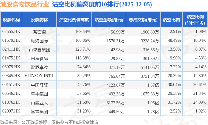 从沽空比例偏离度来看,茶百道、颐海国际、百果园集团沽空比例偏离度位居行业前三,分别为169.44%、168.86%、123.71%。