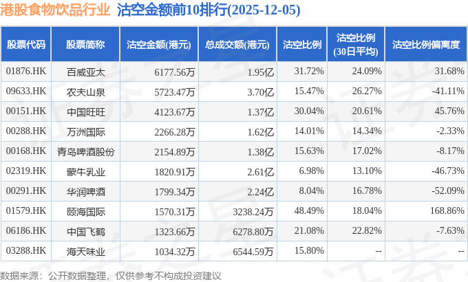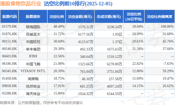 从沽空比例来看,颐海国际、百威亚太、中国旺旺沽空比例位居行业前三,分别为48.49%、31.72%、30.04%。