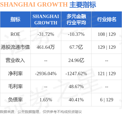 SHANGHAI GROWTH港股市值461.64万港元,在多元金融行业中排名第129。主要指标见下表: