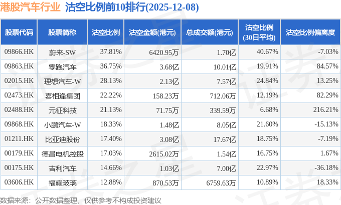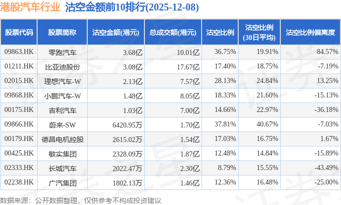 从沽空金额来看,零跑汽车、比亚迪股份、理想汽车-W沽空金额位居行业前三,分别为3.68亿港元、3.08亿港元、2.13亿港元。