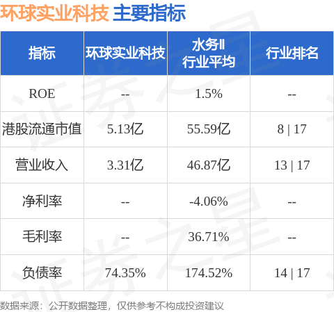 环球实业科技港股市值5.13亿港元,在水务Ⅱ行业中排名第8。主要指标见下表: