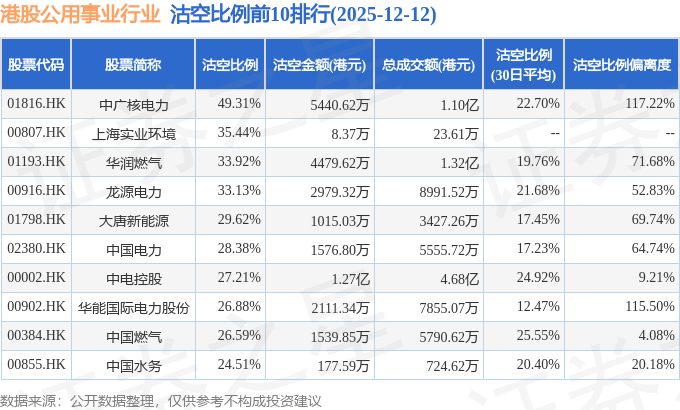 从沽空比例来看,中广核电力、上海实业环境、华润燃气沽空比例位居行业前三,分别为49.31%、35.44%、33.92%。