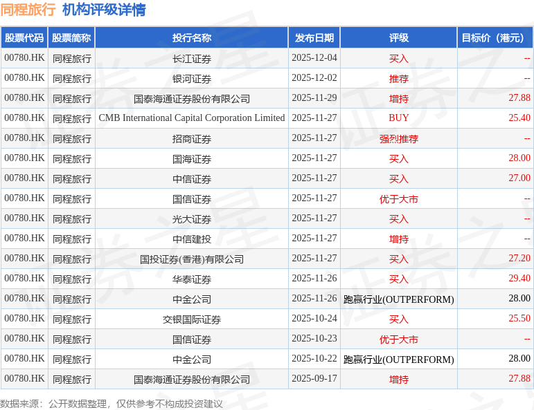 投行对该股的评级以买入为主,近90天内共有7家投行给出买入评级,近90天的目标均价为27.43港元。长江证券最新一份研报给予同程旅行买入评级。