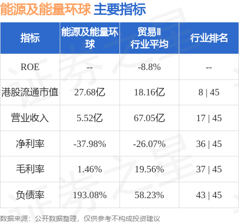 能源及能量环球港股市值27.68亿港元,在贸易Ⅱ行业中排名第8。主要指标见下表: