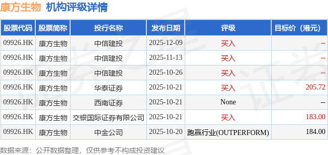 截至2025年12月15日收盘,康方生物(09926.HK)报收于116.2港元,下跌6.67%,成交量1148.23万股,成交额13.59亿港元。投行对该股的评级以买入为主,近90天内共有5家投行给出买入评级,近90天的目标均价为190.91港元。中信建投最新一份研报给予康方生物买入评级。