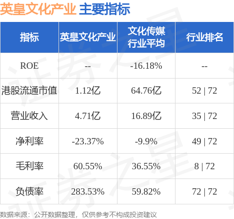 英皇文化产业港股市值1.12亿港元,在文化传媒行业中排名第52。主要指标见下表: