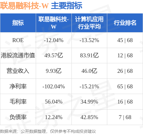 联易融科技-W港股市值49.57亿港元,在计算机应用行业中排名第12。主要指标见下表: