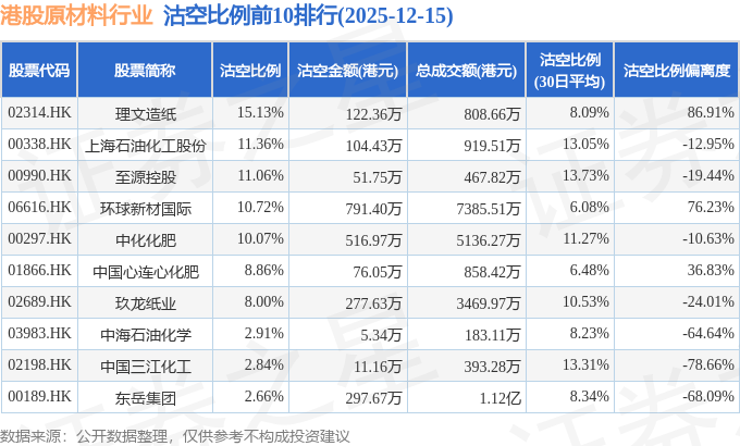 从沽空比例来看,理文造纸、上海石油化工股份、至源控股沽空比例位居行业前三,分别为15.13%、11.36%、11.06%。