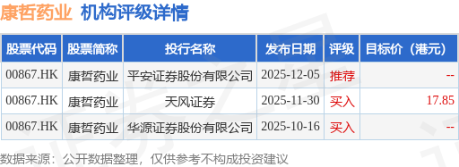 截至2025年12月15日收盘,康哲药业(00867.HK)报收于13.26港元,下跌2.28%,成交量877.9万股,成交额1.16亿港元。投行对该股的评级以买入为主,近90天内共有2家投行给出买入评级,近90天的目标均价为17.85港元。平安证券股份有限公司最新一份研报给予康哲药业推荐评级。