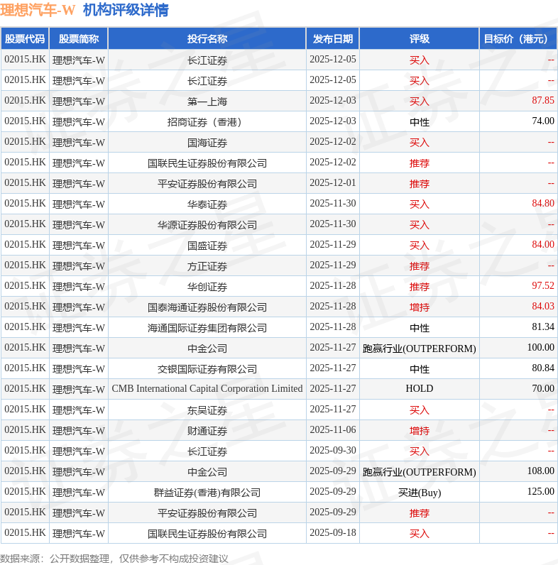 截至2025年12月15日收盘,理想汽车-W(02015.HK)报收于65.6港元,下跌2.89%,成交量920.0万股,成交额6.1亿港元。投行对该股的评级以买入为主,近90天内共有10家投行给出买入评级,近90天的目标均价为89.78港元。长江证券最新一份研报给予理想汽车-W买入评级。