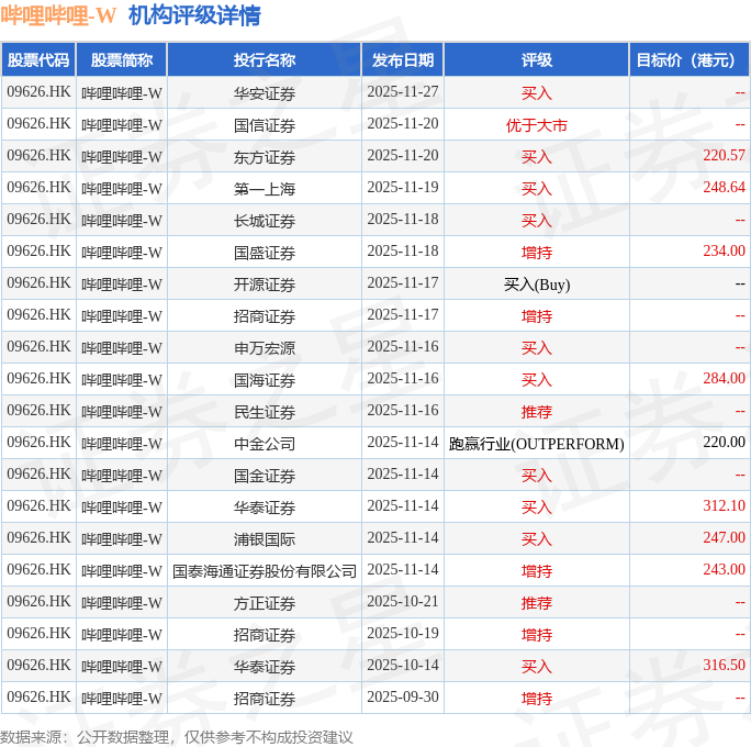 截至2025年12月15日收盘,哔哩哔哩-W(09626.HK)报收于193.7港元,下跌1.02%,成交量264.08万股,成交额5.1亿港元。投行对该股的评级以买入为主,近90天内共有10家投行给出买入评级,近90天的目标均价为258.42港元。华安证券最新一份研报给予哔哩哔哩-W买入评级。