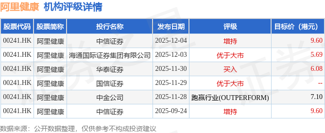 截至2025年12月15日收盘,阿里健康(00241.HK)报收于5.22港元,下跌2.06%,成交量5652.73万股,成交额2.95亿港元。投行对该股的评级以增持为主,近90天内共有2家投行给出增持评级,近90天的目标均价为7.61港元。中信证券最新一份研报给予阿里健康增持评级,目标价9.6港元。