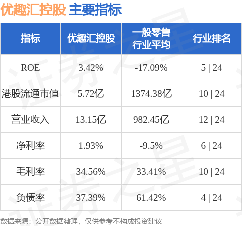 优趣汇控股港股市值5.72亿港元,在一般零售行业中排名第10。主要指标见下表: