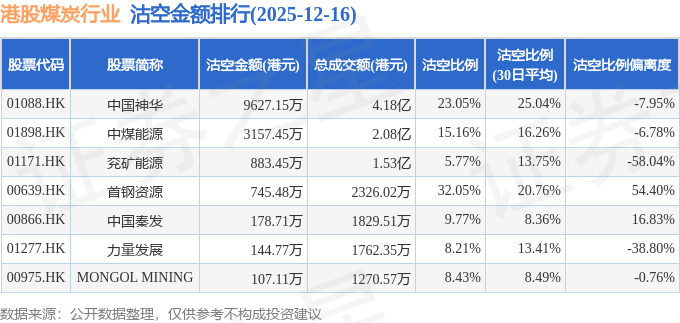 从沽空比例来看,首钢资源、中国神华、中煤能源沽空比例位居行业前三,分别为32.05%、23.05%、15.16%。