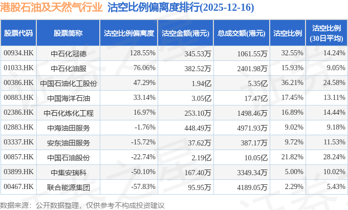 从沽空比例偏离度来看,中石化冠德、中石化油服、中国石油化工股份沽空比例偏离度位居行业前三,分别为128.55%、76.06%、47.29%。