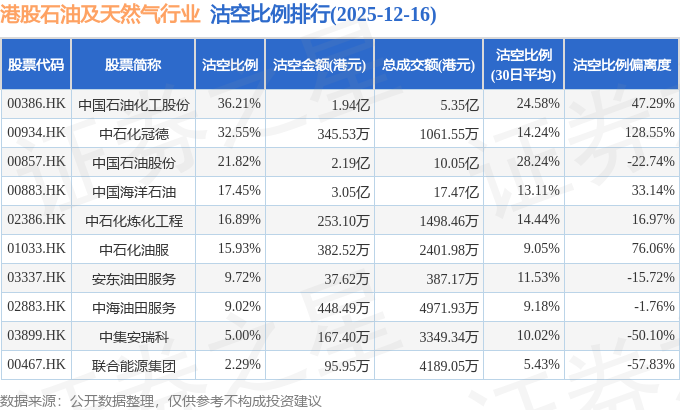 从沽空比例来看,中国石油化工股份、中石化冠德、中国石油股份沽空比例位居行业前三,分别为36.21%、32.55%、21.82%。